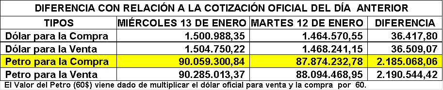 La Tasa del Dólar Oficial (DO) y el Petro hoy Miércoles 13 de Enero 2021 de acuerdo al Banco Central de Venezuela: