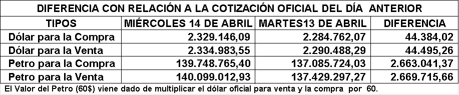 La Tasa del Dólar Oficial (DO) y el Petro de hoy Miércoles 14 de Abril de 2021 de acuerdo al Banco Central de Venezuela: