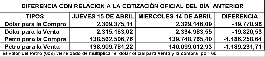 *El Promedio sube Bs. 25.079,47 con relación a la publicación de la mañana de hoy Jueves y sube Bs. 71.724,83 relación a la cotización de ayer Miércoles 14 de Abril en la tarde.