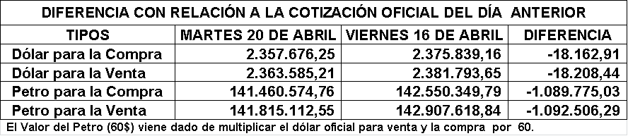 • Ver Dólar y Petro del pasado Viernes 16 de Abril: https://www.aporrea.org/economia/n364234.html