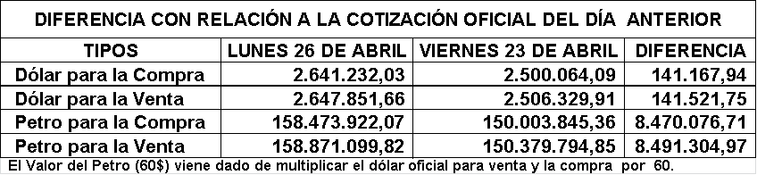 - Ver Dólar y Petro del pasado Viernes 23 de Abril: https://www.aporrea.org/economia/n364389.html