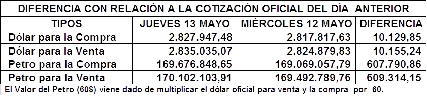 - Ver Dólar y Petro de ayer Miércoles 12 de Mayo: https://www.aporrea.org/economia/n364806.html