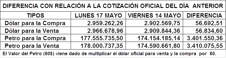 • Ver Dólar y Petro de ayer Viernes 14 de Mayo: https://www.aporrea.org/economia/n364860.html