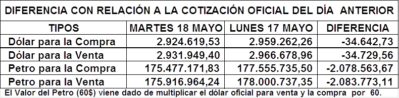 • Ver Dólar y Petro de ayer  Lunes 17 de Mayo: https://www.aporrea.org/economia/n364912.html