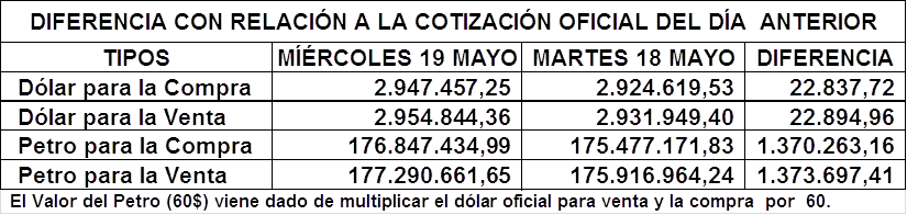 - Ver Dólar y Petro de ayer Martes 18 de Mayo: https://www.aporrea.org/economia/n364936.html
