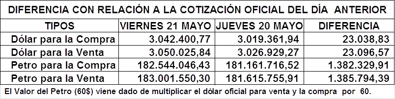 - Ver Dólar y Petro de ayer Jueves 20 de Mayo: https://www.aporrea.org/economia/n364979.html