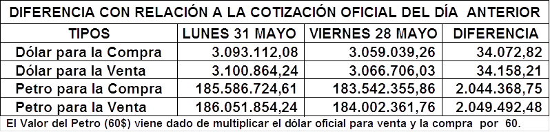 - Ver Dólar y Petro del pasado Viernes 28 de Mayo: https://www.aporrea.org/economia/n365143.html