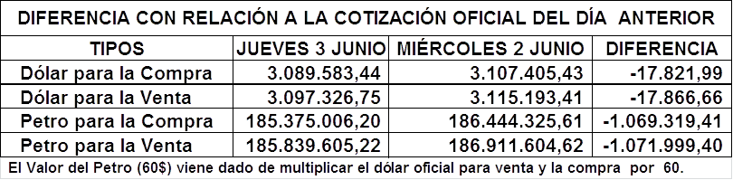 *El Promedio sube Bs. 17.154,12 con relación a la publicación de la mañana de hoy Jueves y sube Bs. 19058,28 con relación a la cotización de ayer Miércoles 2 de Junio en la tarde.