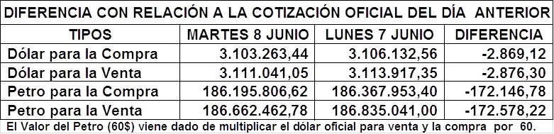Ver Dólar y Petro del pasado Lunes 7 de Junio: https://www.aporrea.org/economia/n365348.html