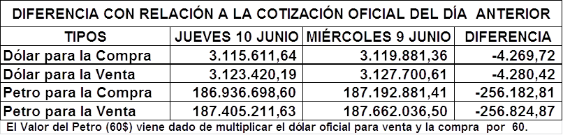 • Ver Dólar y Petro de ayer Miércoles 9 de Junio: https://www.aporrea.org/economia/n365396.html