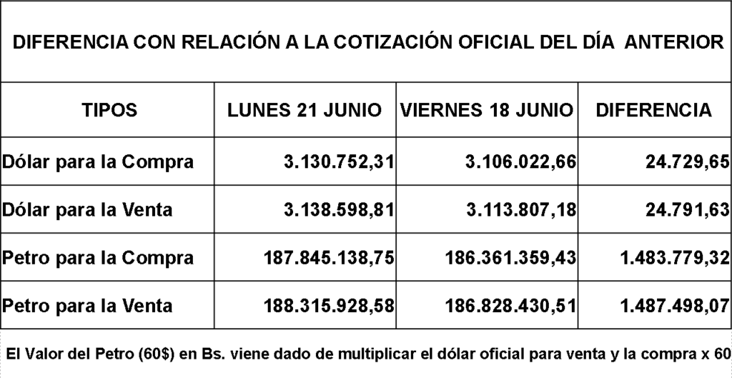 - Ver Dólar y Petro del pasado Viernes 18 de Junio:http://https://www.aporrea.org/economia/n365630.html