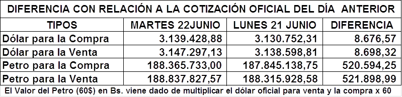 • Ver Dólar y Petro ayer Lunes 21 de Junio:  https://www.aporrea.org/economia/n365686.html