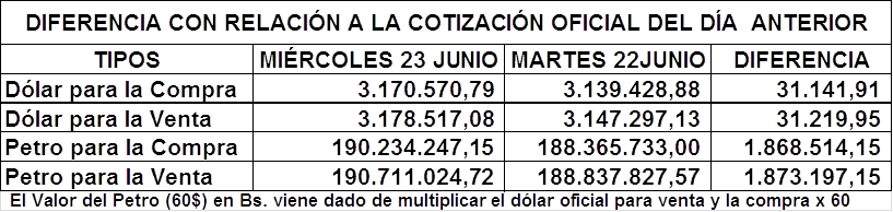 - Ver Dólar y Petro ayer Martes 22 de Junio: https://www.aporrea.org/economia/n365707.html