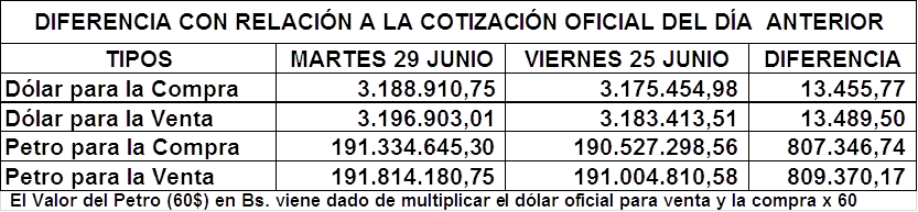 - Ver Dólar y Petro del pasado Viernes 25 de Junio: https://www.aporrea.org/economia/n365777.html