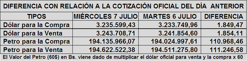 - Ver Dólar y Petro de ayer Martes 6 de Julio: https://www.aporrea.org/economia/n365987.html