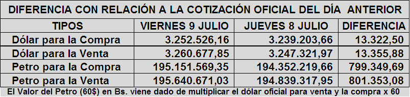 *El Promedio sube Bs. 10.589,43 con relación a la publicación de la mañana de hoy Viernes y sube Bs. 12.979,68 con relación a la cotización de ayer Jueves 8 de Julio en la tarde.