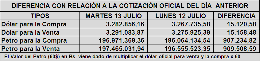 - Ver Dólar y Petro de ayer Lunes 12 de Julio: https://www.aporrea.org/economia/n366125.html