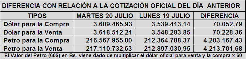 - Ver Dólar y Petro de ayer Lunes 19 de Julio: https://www.aporrea.org/economia/n366301.html