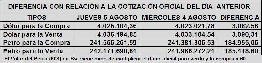 - Ver Dólar y Petro de ayer Miércoles 4 de agosto: https://www.aporrea.org/economia/n366682.html