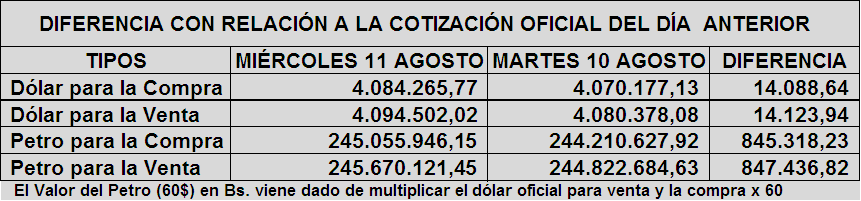 - Ver Dólar y Petro de ayer Martes 10 de agosto: https://www.aporrea.org/economia/n366823.html