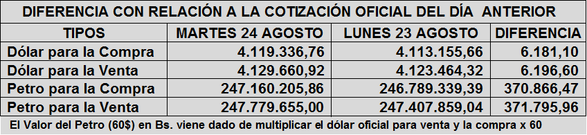 - Ver Dólar y Petro de ayer Lunes 23 de agosto: https://www.aporrea.org/economia/n367201.html