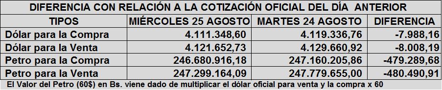 - Ver Dólar y Petro de ayer Martes 24 de agosto: https://www.aporrea.org/economia/n367227.html