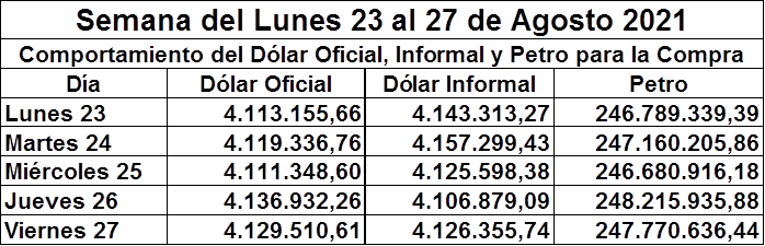 La Tasa del Dólar Oficial (DO) y el Petro de ayer Viernes 27 de agosto de 2021 de acuerdo al Banco Central de Venezuela:
