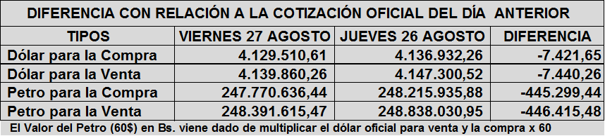 • Ver Dólar y Petro de ayer Jueves 26 de agosto: https://www.aporrea.org/economia/n367292.html