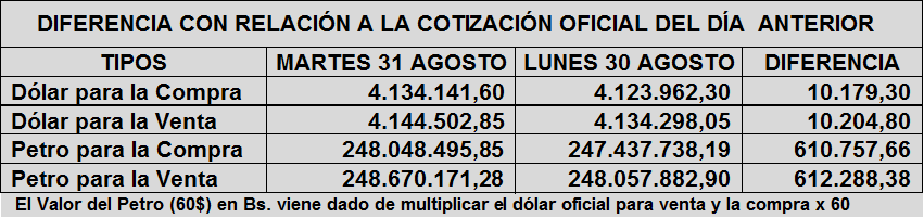 - Ver Dólar y Petro de ayer 30 de agosto: https://www.aporrea.org/economia/n367378.html