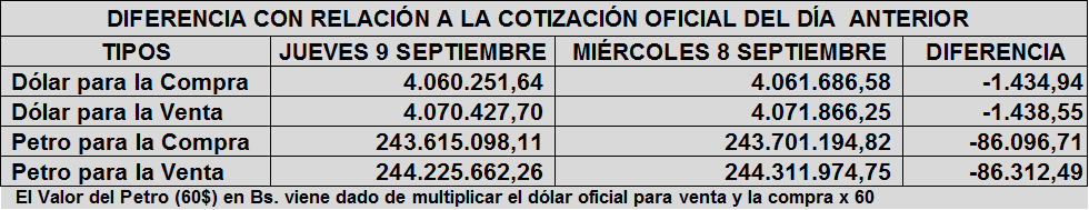 La Tasa del Dólar Oficial (DO) y el Petro de hoy Jueves 9 de septiembre de 2021 de acuerdo al Banco Central de Venezuela: