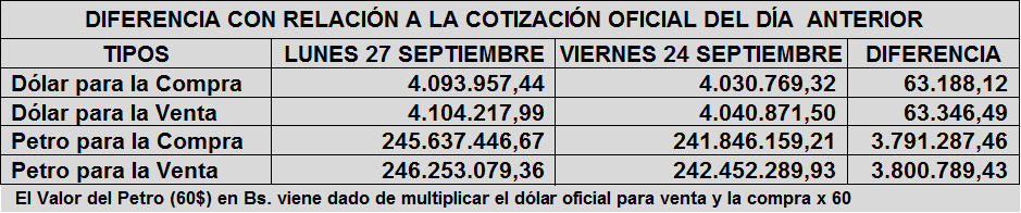 La Tasa del Dólar Oficial (DO) y el Petro de hoy Lunes 27 de septiembre de 2021 de acuerdo al Banco Central de Venezuela: