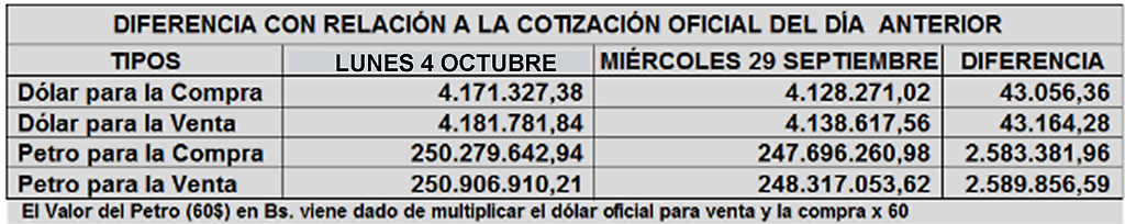La Tasa del Dólar Oficial (DO) y el Petro que regira el 4 de Octubre, debido al Feriado Bancario Jueves 30 de Septiembre y Viernes 1º Octubre de 2021 de acuerdo a la publicaciòn del Banco Central de Venezuela, es la siguiente: