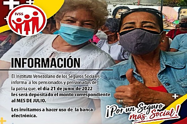 El IVSS informó que adultas y adultos mayores de la patria el día de mañana (hoy) 21 de junio, se hará efectivo el pago de la pensión del mes de Julio", reseña un mensaje difundido por el organismo de seguros en su cuenta en Twitter.