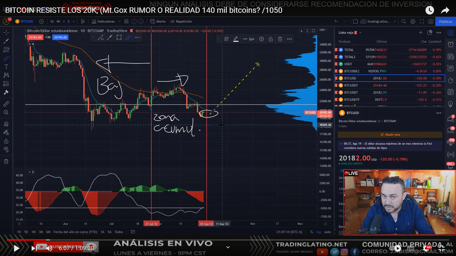 Sin embargo, aclaró que para el día de hoy no tiene una posición alcista o bajista sobre el precio del bitcoin, ya que el movimiento se encuentra lateralizado. Recalcó que la zona actual hubiese sido una zona perfecta de compra para el sí no hubiese comprado anteriormente.