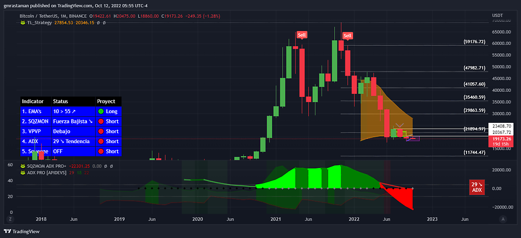 En temporalidades mensuales, el precio del bitcoin está comenzando a dar señales de una posible recuperación, sin embargo, al analizar el precio en una temporalidad tan grande, hay que tener en cuanta que durante un mes puede llegar a caer hasta un 50%, como lo hizo en mayo del 2021, antes de retomar su movimiento alcista.