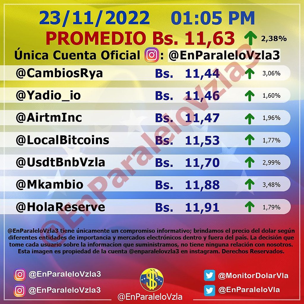 23-11-22.-Este miércoles 23 de noviembre de 2022, el dólar paralelo cerró en 11,63 bolívares por unidad, mostrando un incremento de 2,38% en la cotización, informó @EnParaleloVzla en Telegram.