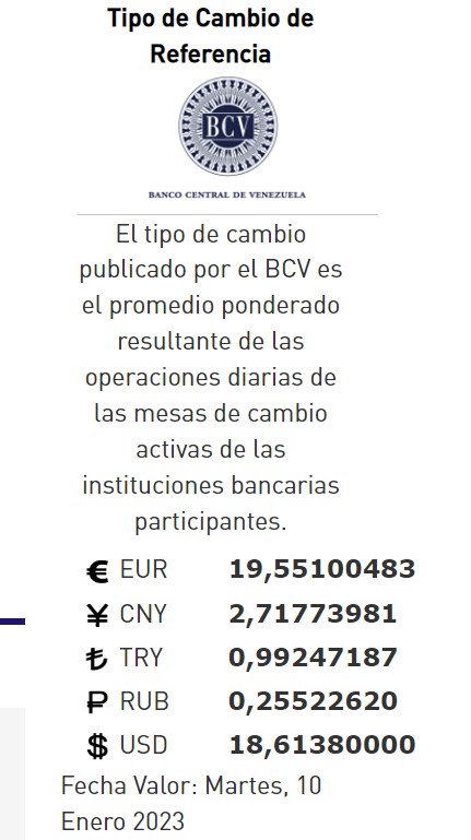 05-01-23.-El precio del dólar en el Banco Central de Venezuela (BCV) se cotizó este lunes 09 Enero de 2023 en Bs. 18,61 por unidad según la última actualización en su página web oficial y redes oficiales.