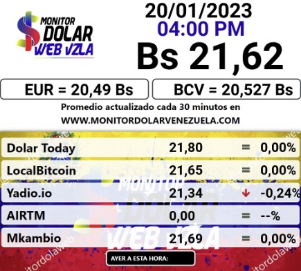Por otro lado, el dólar paralelo en promedio cerró este viernes 20 de enero 2023 en Bs.21,62 la unidad, según Monitor-dólar Venezuela.