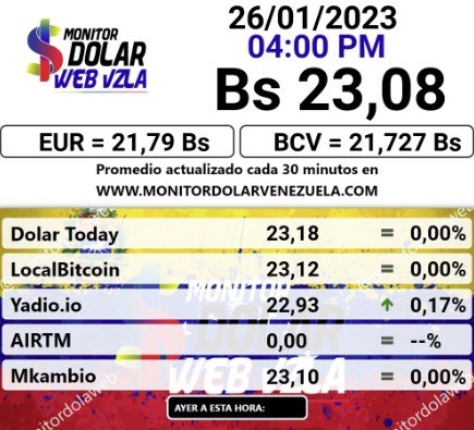 Por otro lado, el dólar paralelo en diversas plataformas cerró este jueves 25 de enero 2023 en un promedio de Bs.23,08 la unidad, según Monitor-dólar Venezuela.
