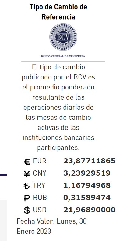 27-01-23.-El precio del dólar en el Banco Central de Venezuela (BCV) se cotizó este viernes 27 Enero de 2023 en Bs. 21,96 por unidad según la última actualización en su página web oficial y redes oficiales.