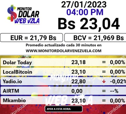 Por otro lado, el dólar paralelo en diversas plataformas cerró este viernes 27 de enero 2023 en un promedio Bs.23,04 la unidad, según Monitor-dólar Venezuela.
