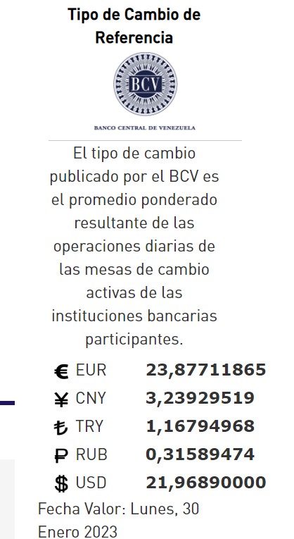 30-01-23.-El precio del dólar en el Banco Central de Venezuela (BCV) se cotizó este lunes 30 Enero de 2023 en Bs. 21,96 por unidad según la última actualización en su página web oficial y redes oficiales.