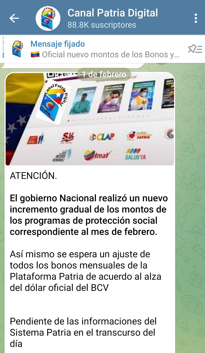 Según informó el Canal Patria Digital en Telegram, se espera que haya un ajuste de todos los bonos mensuales de la Plataforma Patria, de acuerdo «al alza del dólar oficial del Banco Central de Venezuela (BCV)».