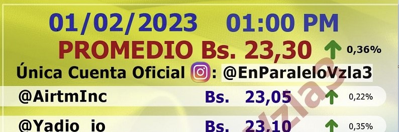 Por otro lado, el dólar paralelo en diversas plataformas cerró en este mismo día 01 de febreo 2023 en un promedio Bs.23,30 la unidad, según Monitor-dólar Venezuela.