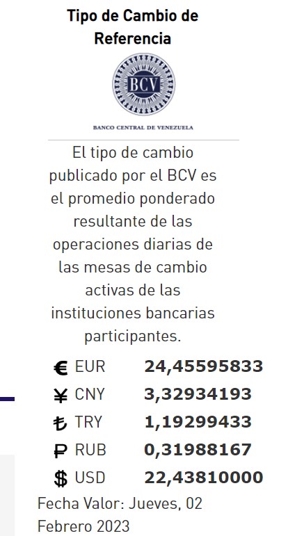 01-02-23.-El precio del dólar en el Banco Central de Venezuela (BCV) se cotizó este miércoles 01 de febrero de 2023 en Bs. 22,43 por unidad según la última actualización en su página web oficial y redes oficiales.https://www.bcv.org.ve/