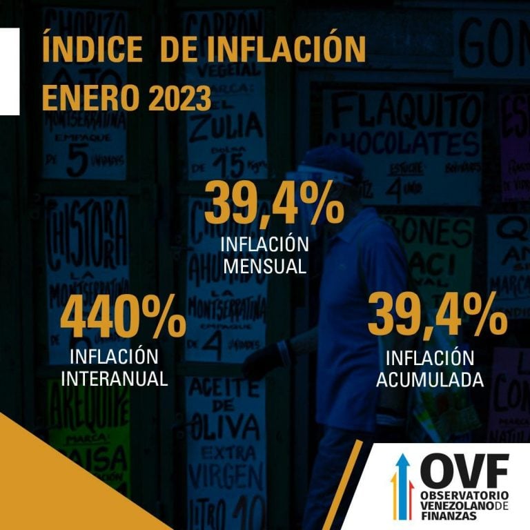 07-03-23.-El Observatorio Venezolano de Finanzas (OVF) informó que la tasa de inflación en enero de 2023 se situó en 39,4%, en tanto que la tasa anualizada fue 440%.