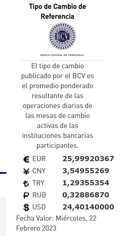 17-02-23.-El precio del dólar en el Banco Central de Venezuela (BCV) se cotizó este viernes de febrero de 2023 en Bs. 24,40 por unidad según la última actualización en su página web oficial y redes oficiales.