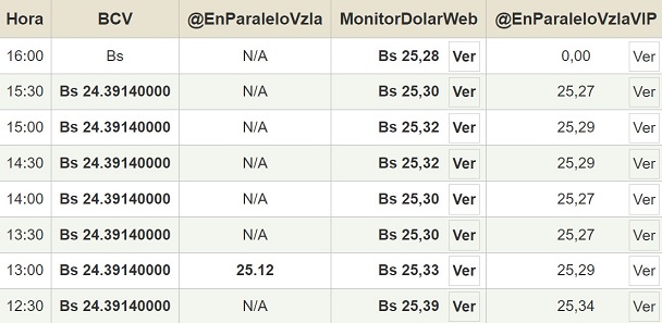 Por otro lado, el dólar paralelo en diversas plataformas en el día de hoy se mantuvo estable y cerró en un promedio de Bs.25,28 la unidad, según Monitor-DólarVenezuela.
