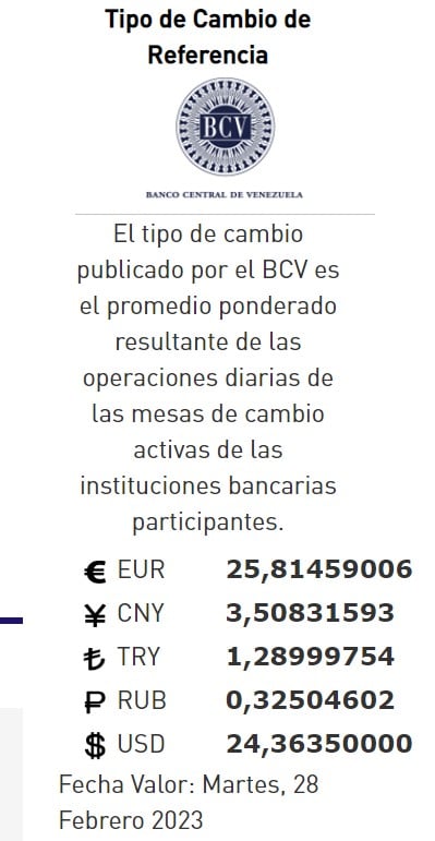 27-02-23.-El precio del dólar en el Banco Central de Venezuela (BCV) se cotizó este lunes 27 de febrero 2023 en Bs. 24,36 por unidad según la última actualización en su página web oficial y redes oficiales.