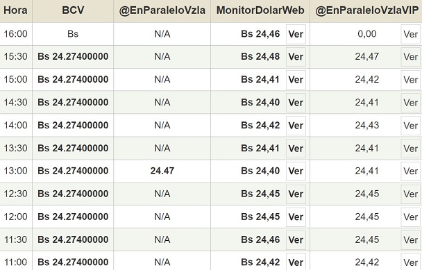 Por otro lado, el dólar paralelo en diversas plataformas se mantuvo estable y cerró en un promedio de Bs.24,46 la unidad, según Monitor-DólarVenezuela.
